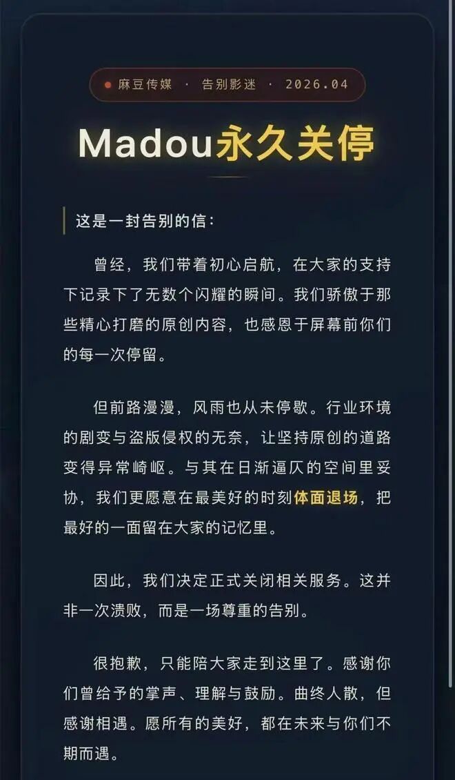 “行业环境的剧变与盗版侵权的无奈,让坚持原创的道路变得异常崎岖。与其在日渐逼仄的空间里妥协,我们更愿意在最美好的时刻体面退场。”这是他们告别信里最扎心的一段话。