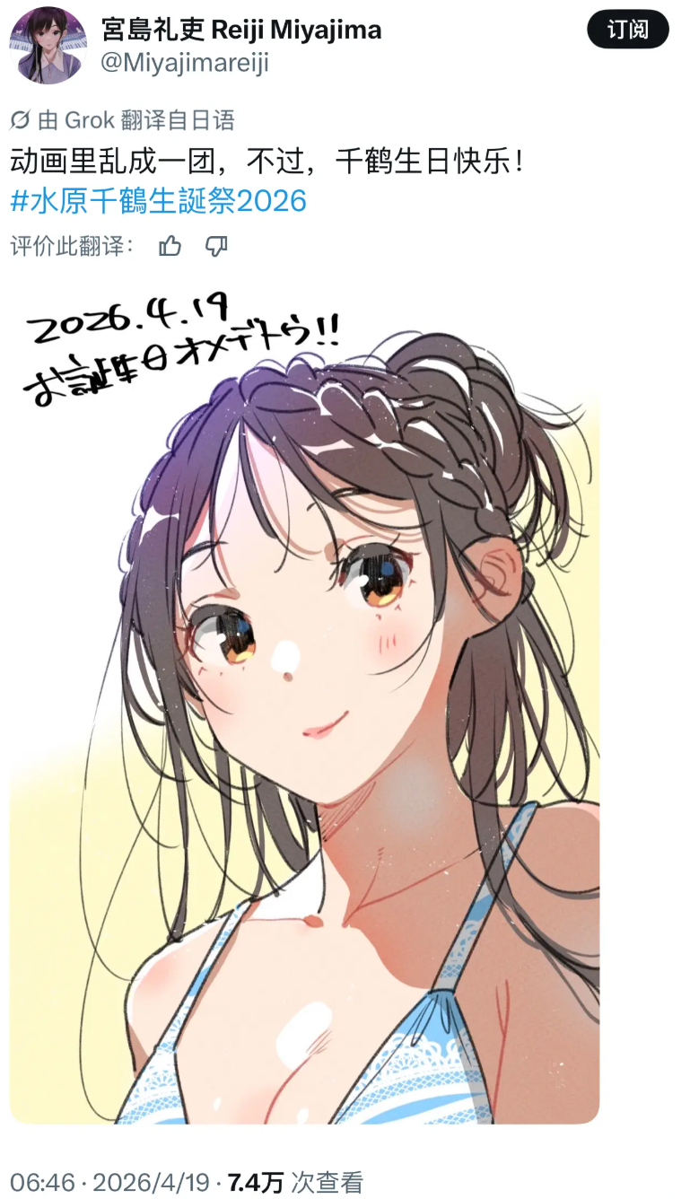 而其中女主水原千鹤(一之濑千鹤)官方设定的生日是4月19日。同时呢,这一天也是《租借女友》动画第5季第2集的更新时间