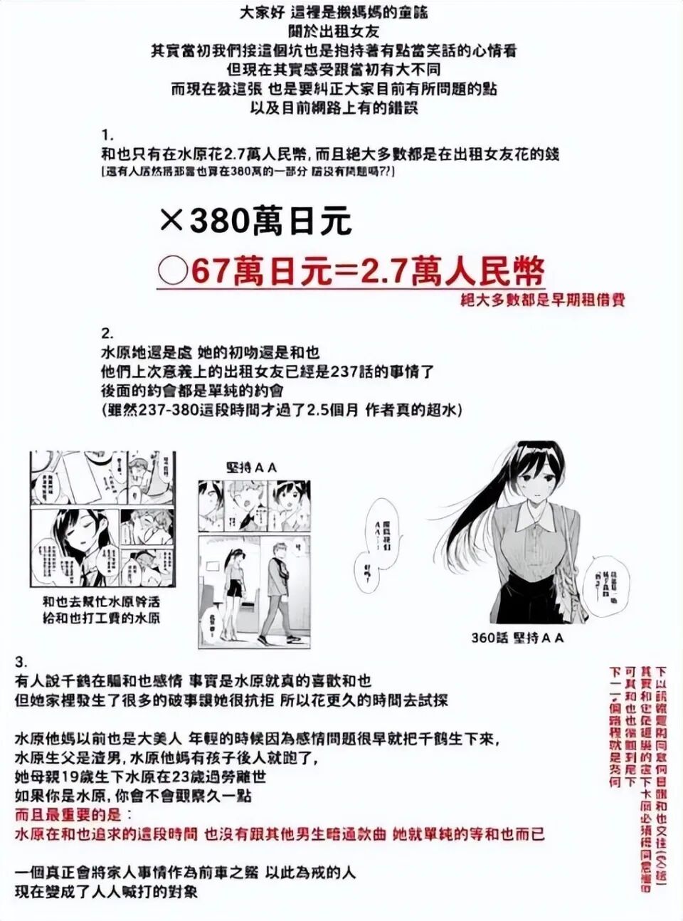 比如男主给水原千鹤花费的一共67万日元,大部分是租借平台费用,日常约会是两人AA,而刻意钓着男主都是有原因的。