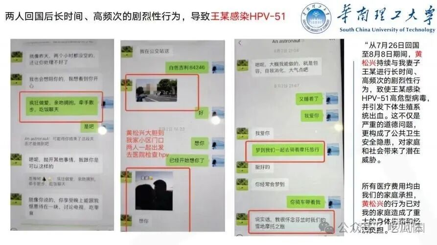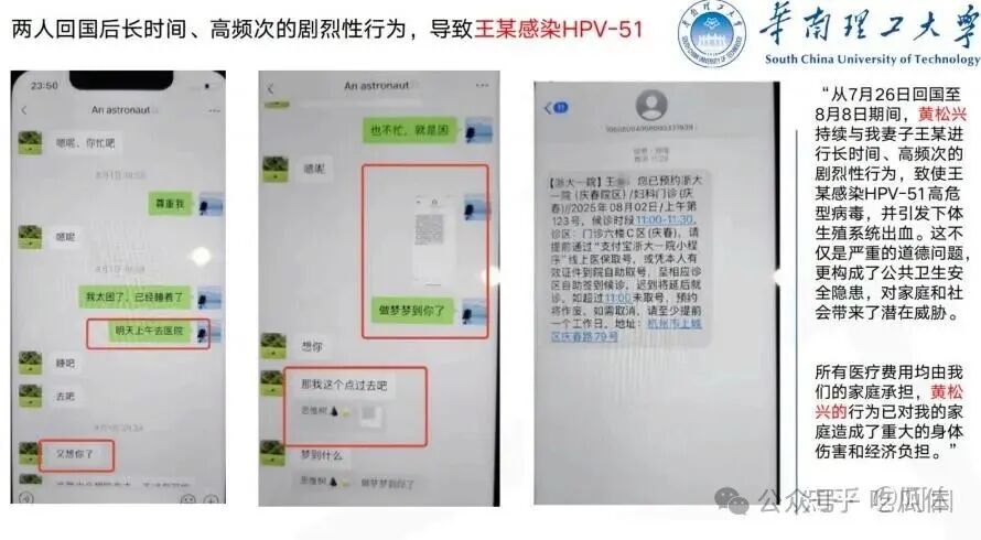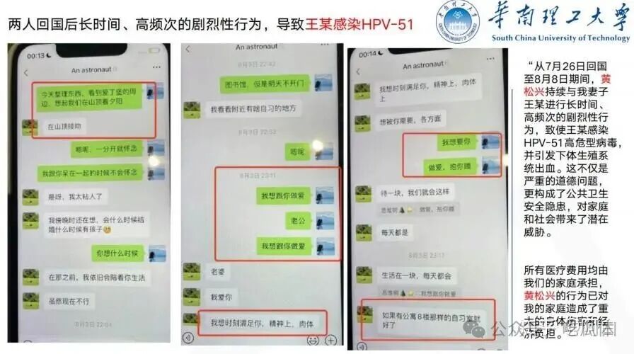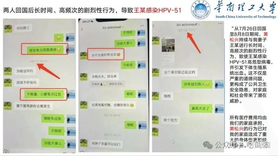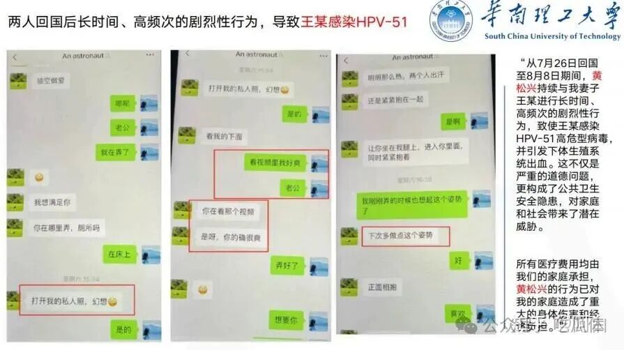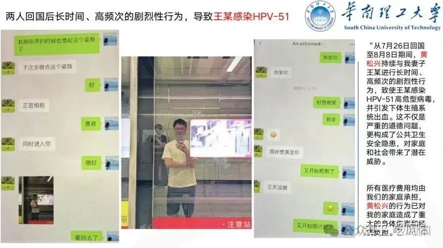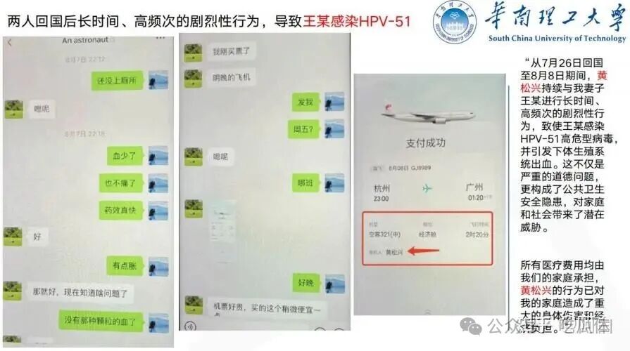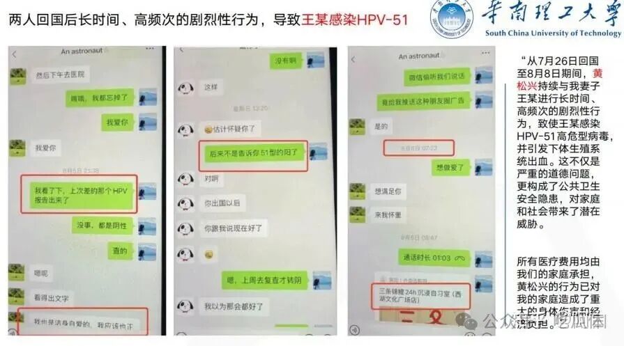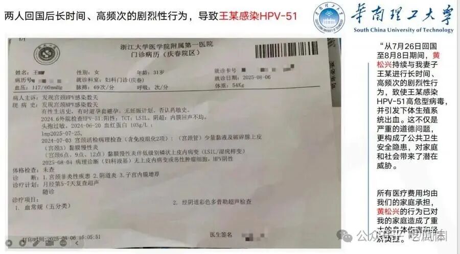 举报人称,“从7月26日回国至8月8日期间,黄某某持续与我妻子王某进行长时间、高频次的剧烈X行为,致使王某感染HPV-51高危型病毒,并引发下体生殖系统出血。这不仅是严重的道德问题更构成了公共卫生安全隐患,对家庭和社会带来了潜在威胁。”