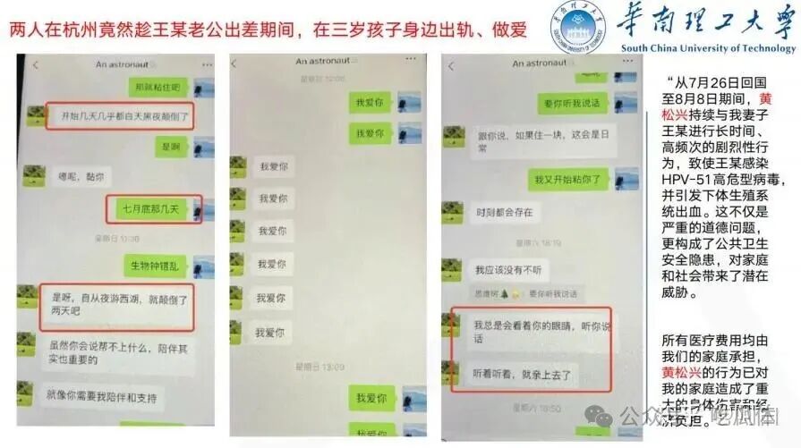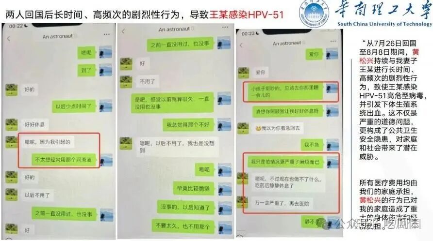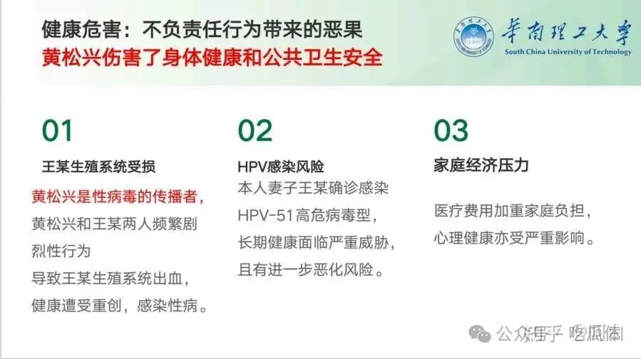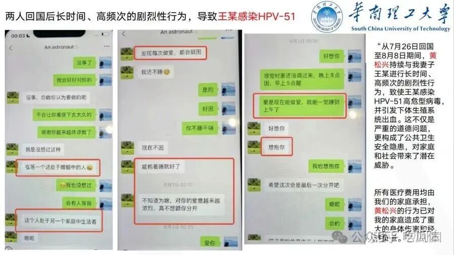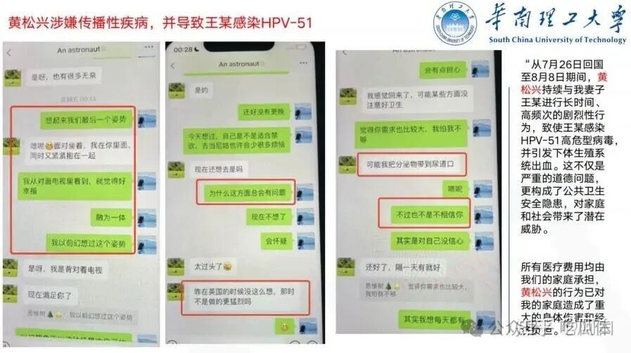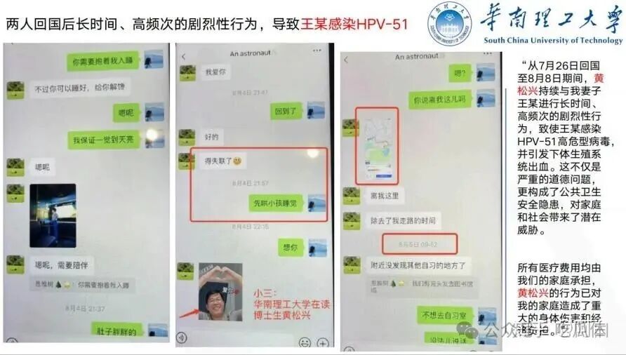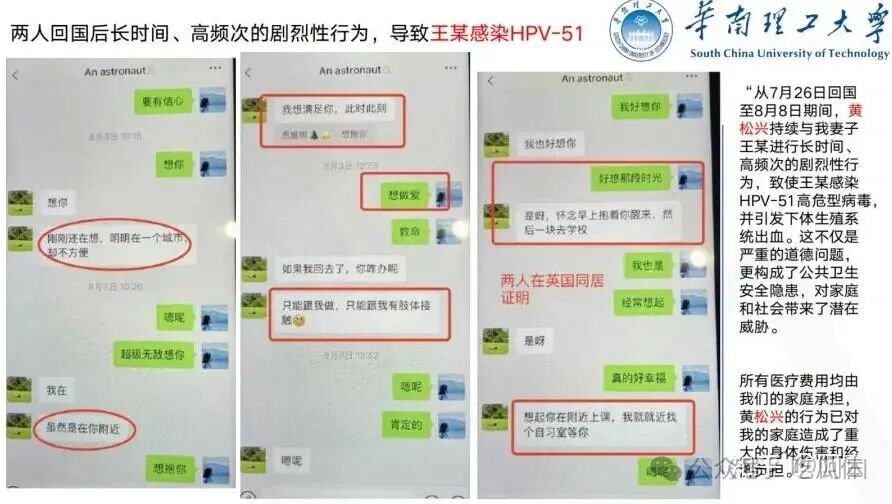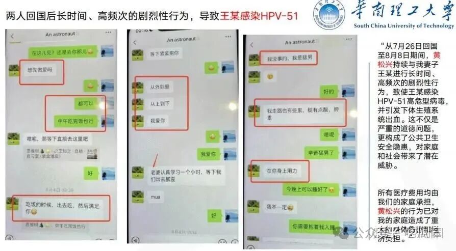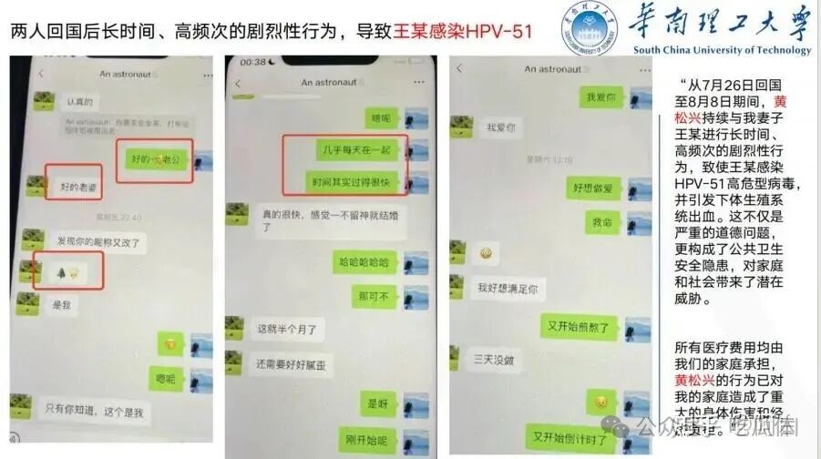 举报人称,“从7月26日回国至8月8日期间,黄某某持续与我妻子王某进行长时间、高频次的剧烈X行为,致使王某感染HPV-51高危型病毒,并引发下体生殖系统出血。这不仅是严重的道德问题更构成了公共卫生安全隐患,对家庭和社会带来了潜在威胁。”